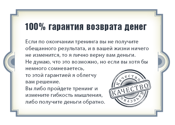 Ведь вы наверняка знаете, что образ мыслей определяет образ жизни. Значит, изменив способ думать, вы можете кардинально изменить свою реальность. Хотите попробовать? Научиться мыслить по-другому, жить по-другому? Заманчиво звучит? Тогда записывайтесь на тренинг!